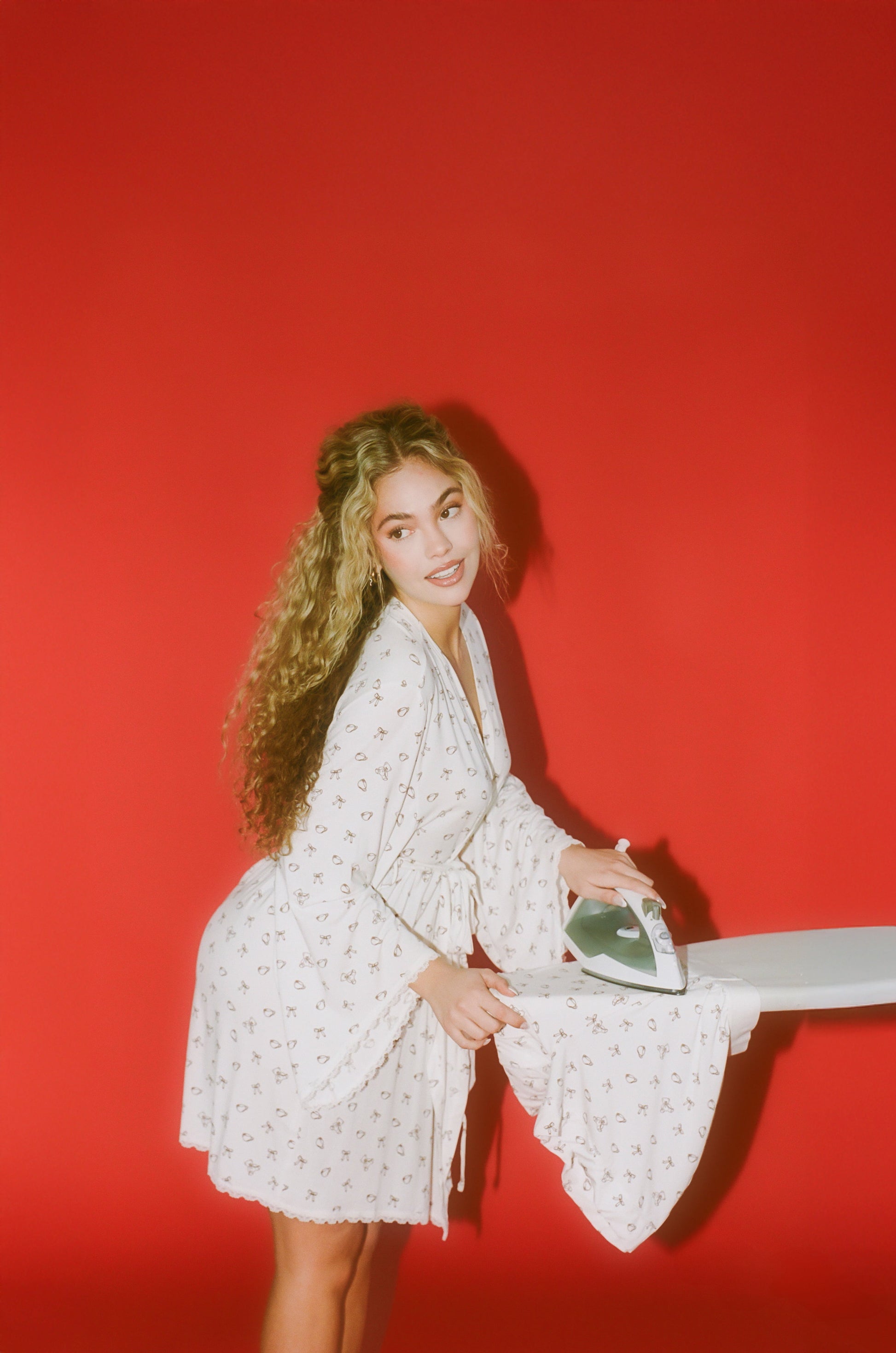 This mini-length robe is cut from lightweight stretch modal jersey, trimmed with lace along the hem and wide sleeves. A matching tie-belt draws in the wrap waist.