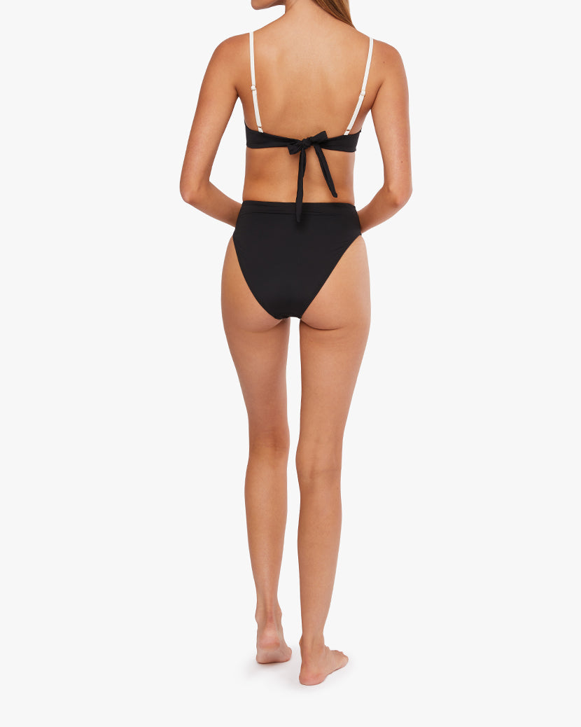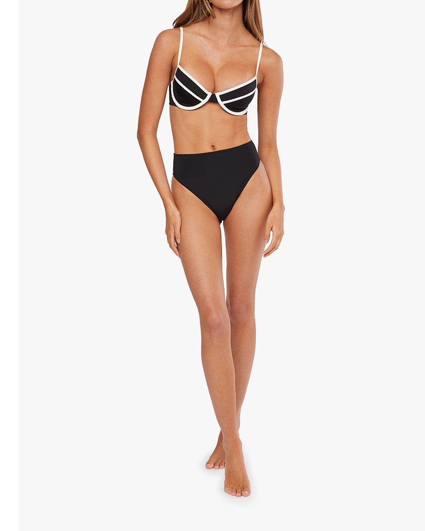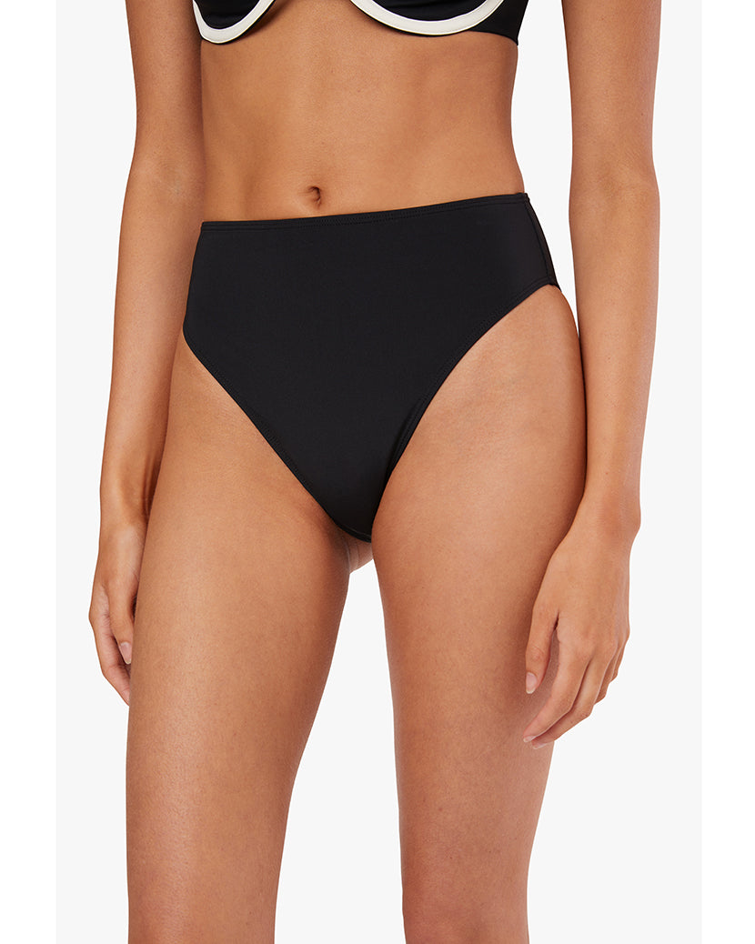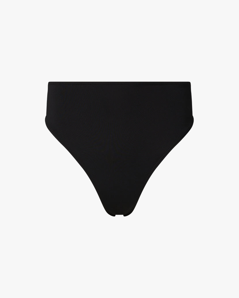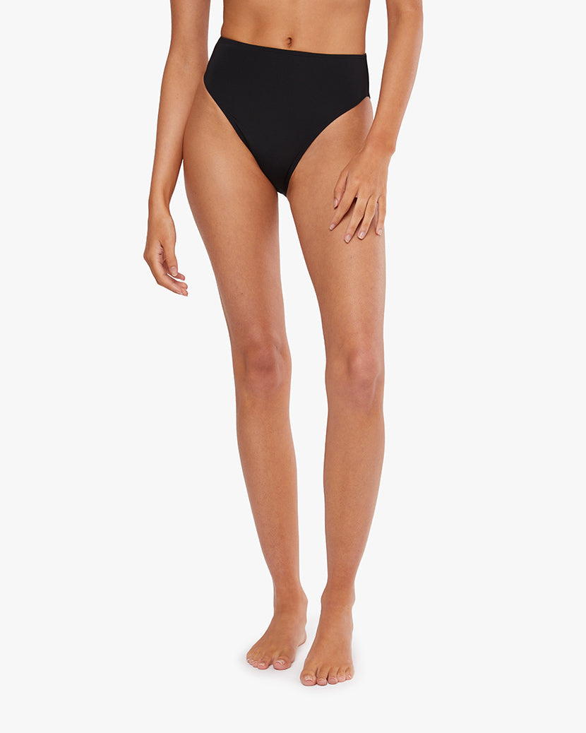Made from smoothing swim fabric, the high rise bottom sits slightly above the waist with a high-cut leg and fuller-coverage back.