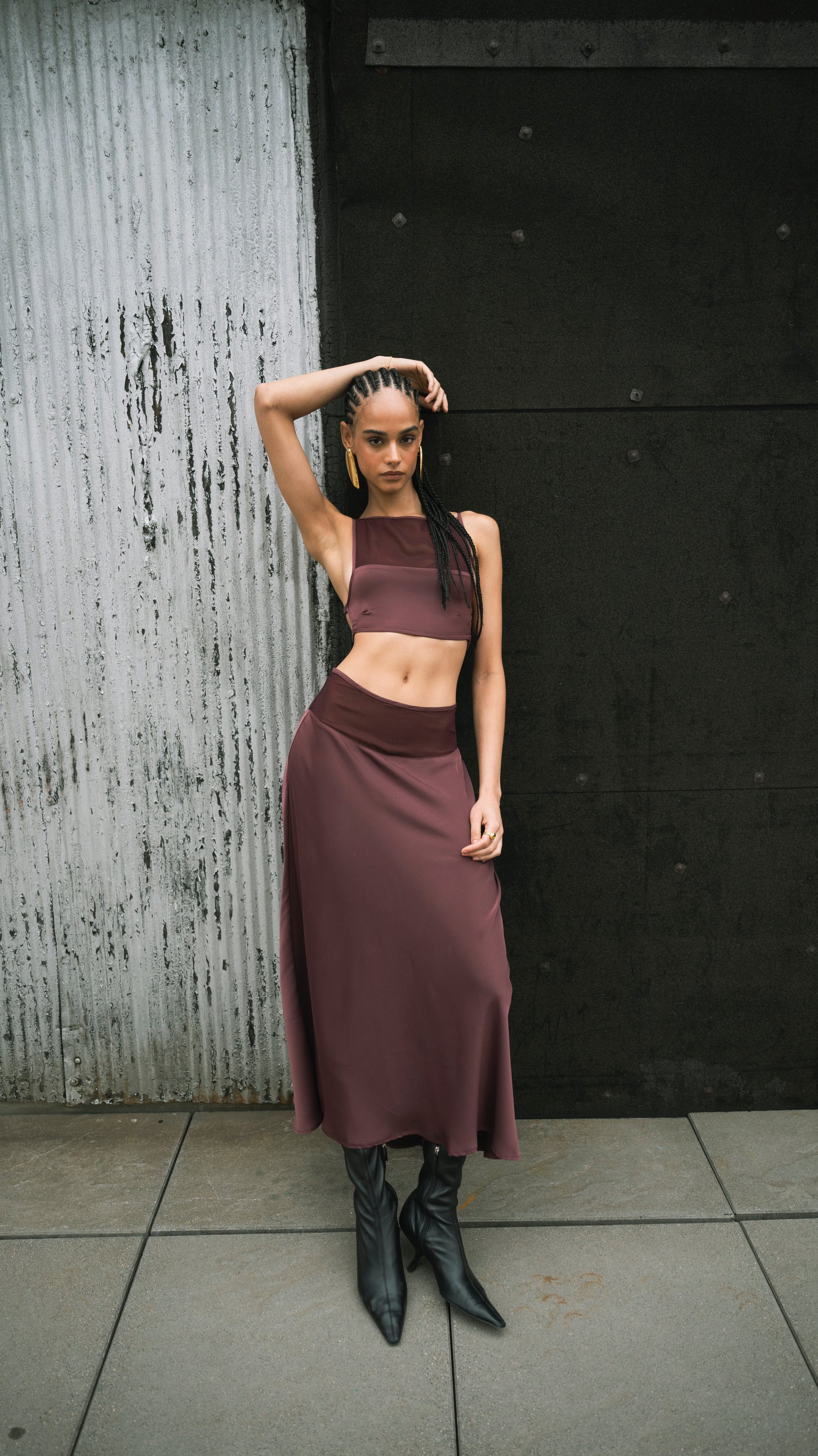 The Midi Chiffon Cutout Skirt is styled with the Square Neck Cami Top.