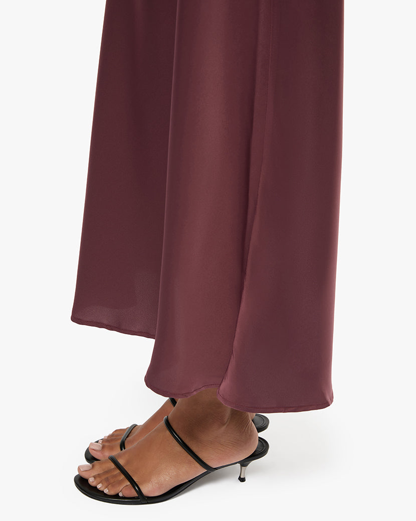 This cutout skirt comes in silky charmeuse with a waist panel made from chiffon fabric. It has a bias-cut slip silhouette and features a discreet zip closure in back.