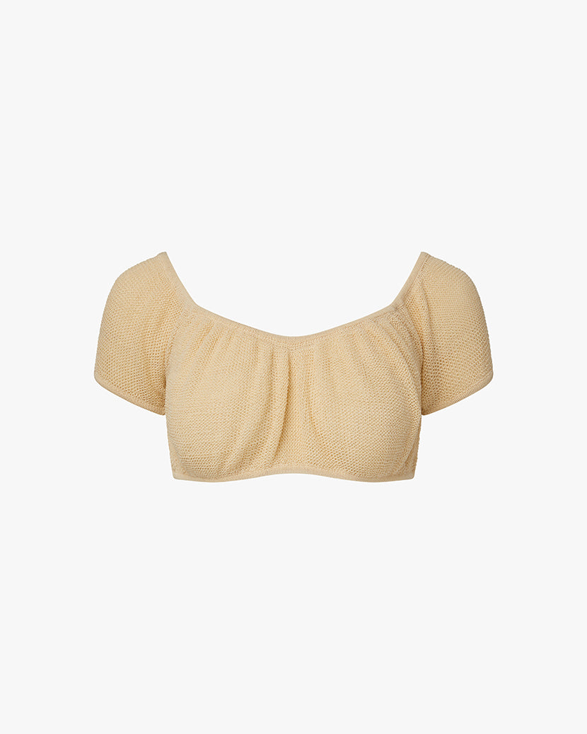 This scrunchie puff sleeve top is made from lightweight crochet knit with elastic along the neckline, underband, and cuffs for stretch.