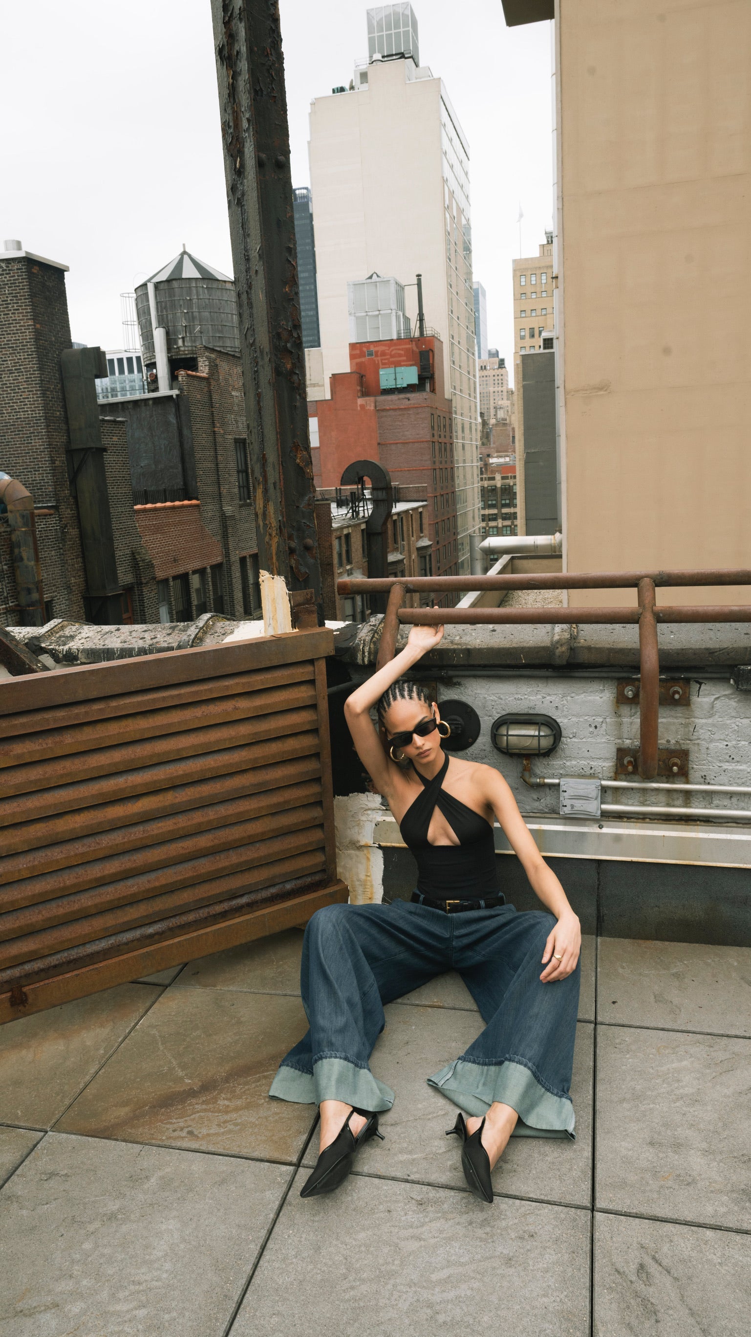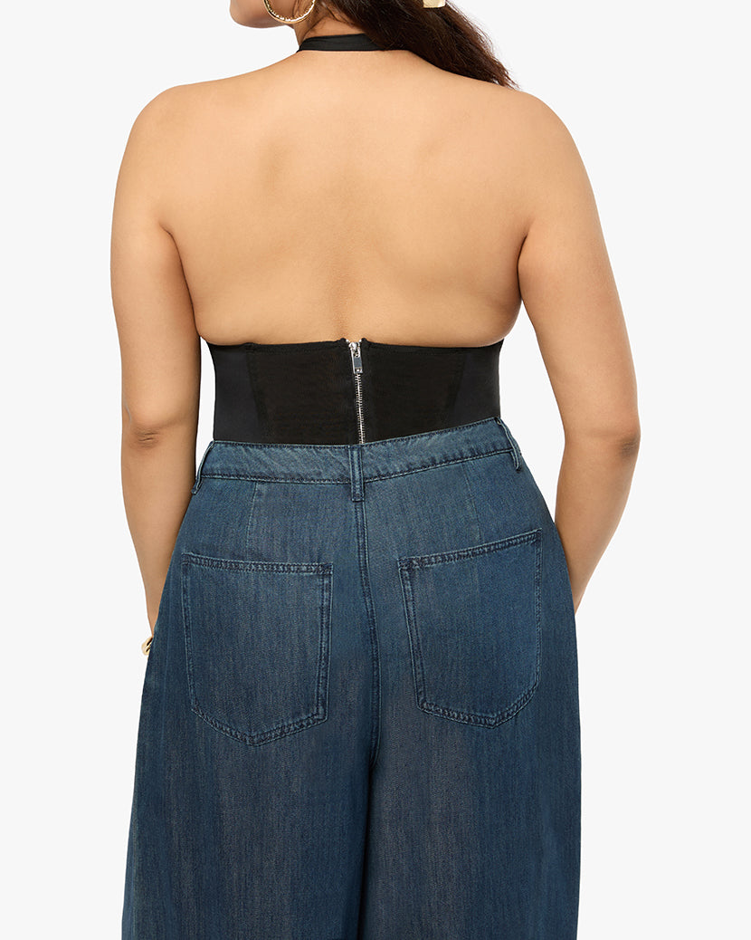 The Cross Halter Corset Top is styled with the Pleated Wide Leg Jean or the Silky Slip Skirt.