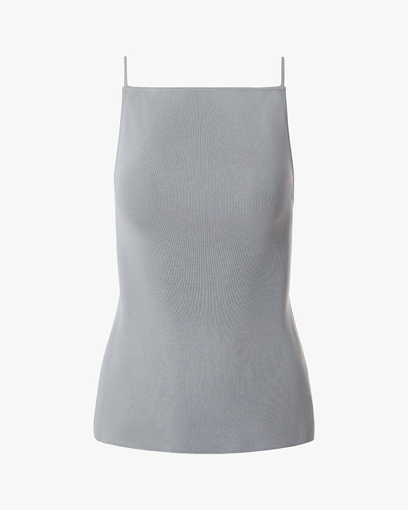 This ribbed top is designed in a stretch knit fabric with a high neck and open back with adjustable straps.
