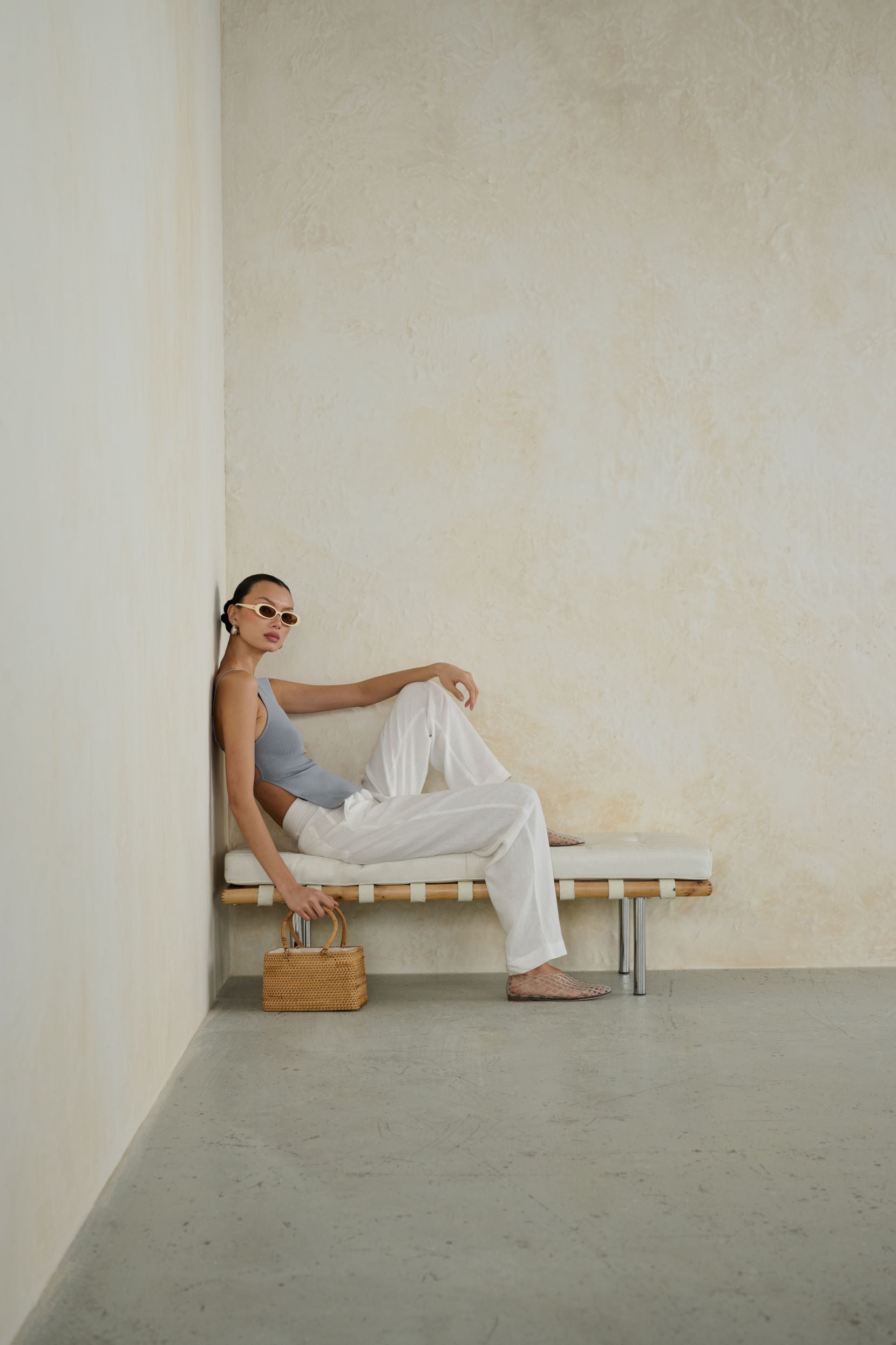 The High Straight Neck Top is styled with the Trouser Pants.