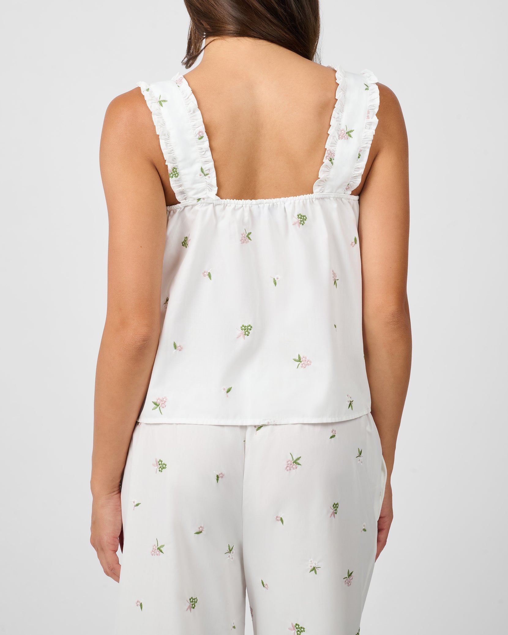 This poplin tank is designed with floral embroidery, ruffle straps and a button-down faux placket. It is encased with elastic that traces the top edge offering an easy pull-on fit.