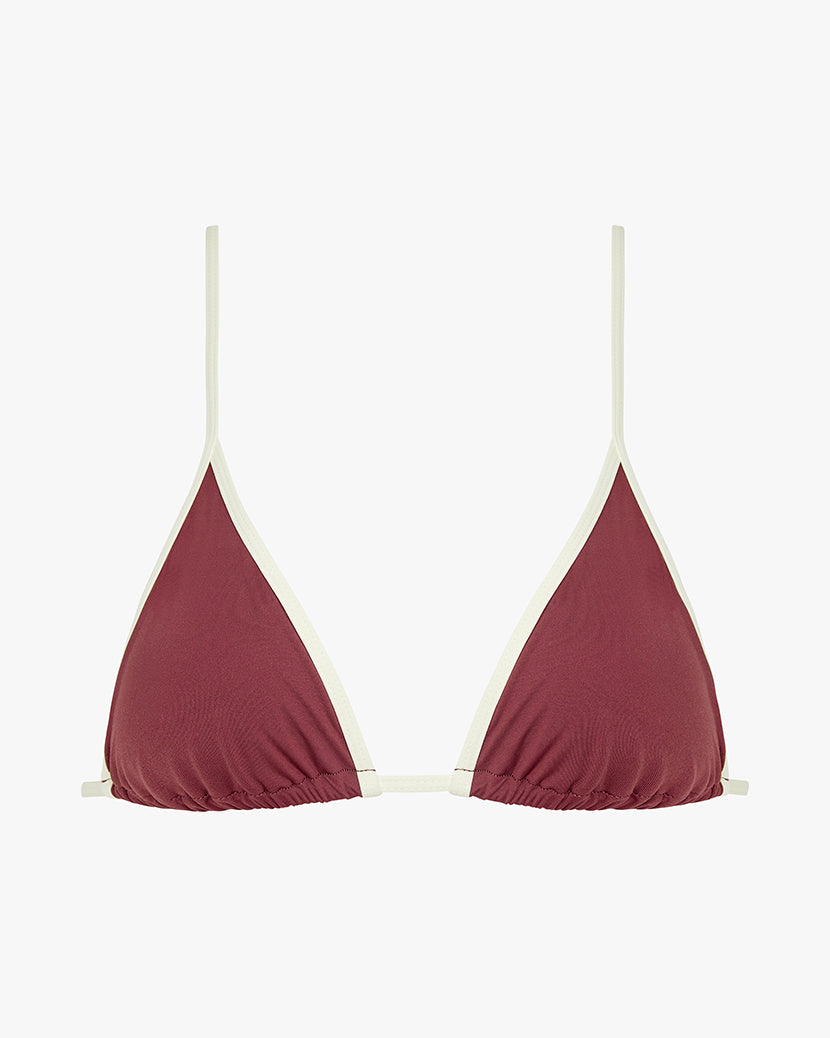 Cooper is an elongated triangle top with adjustable shoulder straps, contrast binding and a tie-back closure, a more comfortable alternative to traditional halter strings. Designed to enhance curves while flaunting subtle side exposure, it's an alluring spin on a classic bikini.