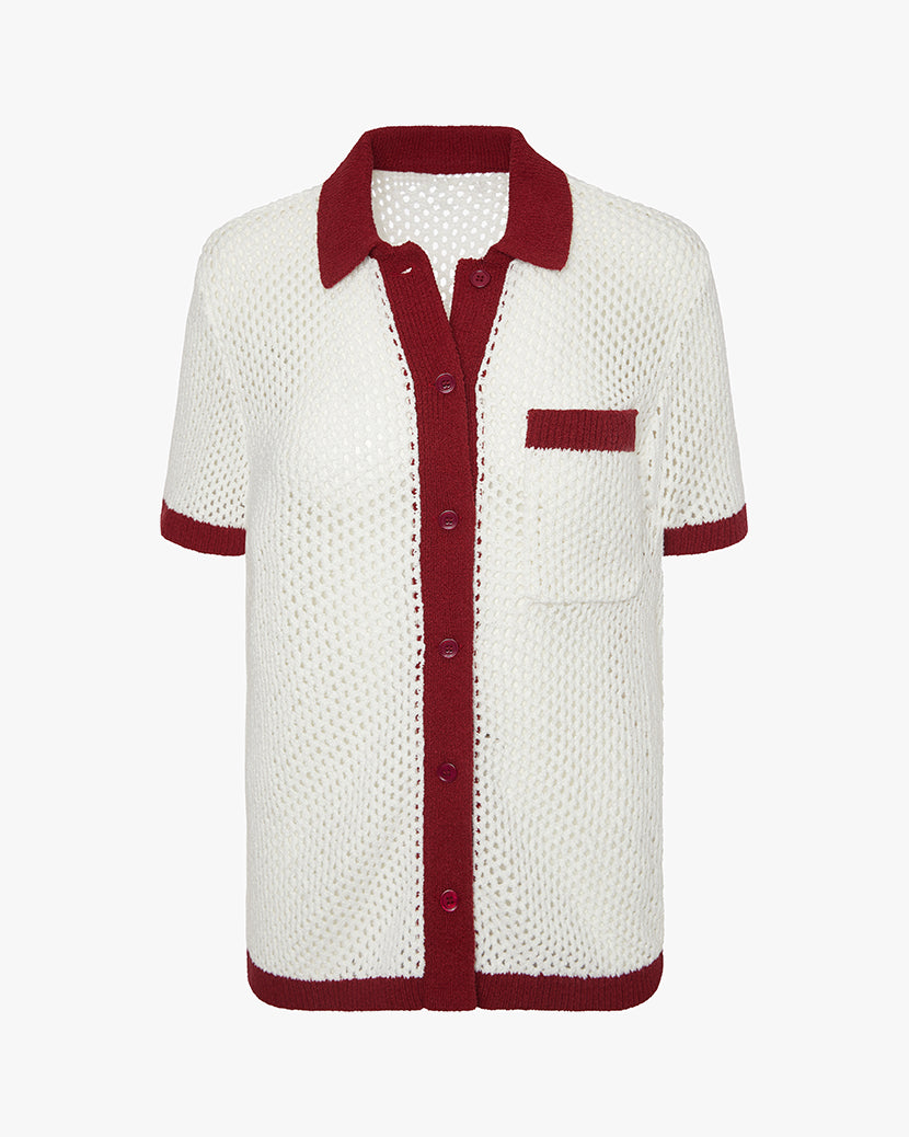 Cut for a boxy, oversized fit, this crochet button-down has a spread collar and drop-shoulder short sleeves.