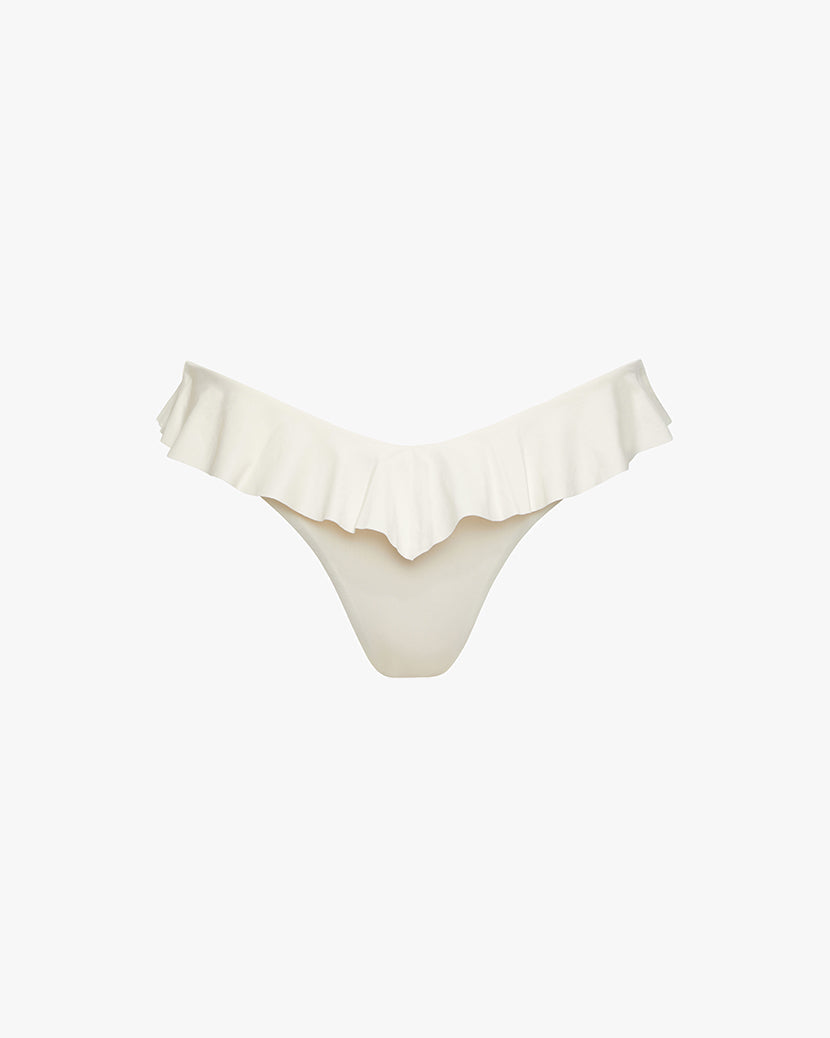 An update to our Delilah bikini bottom, this flounced version is cut high with cheeky back coverage. It sits flatteringly on the hips with a v-contoured waistband, trimmed in ruffles.